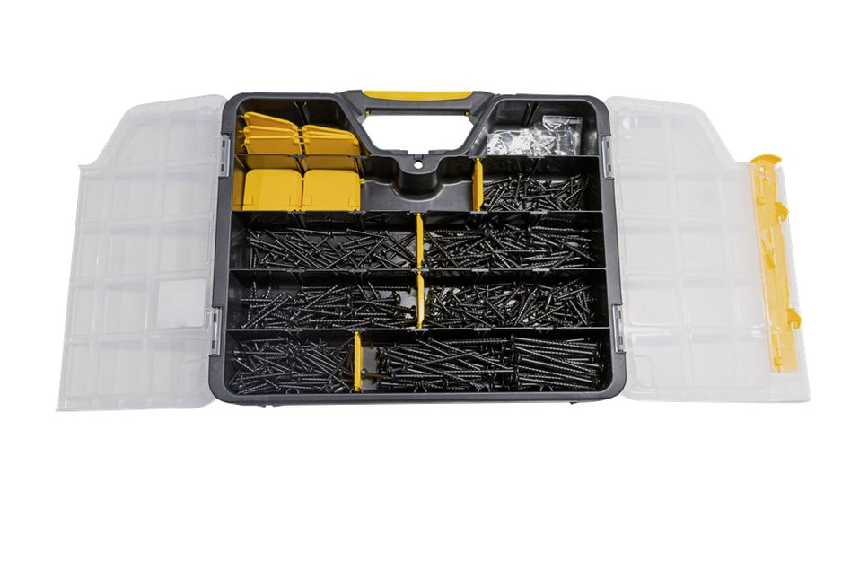 Een assortimentskist is een opbergoplossing speciaal ontworpen voor het sorteren en organiseren van kleine onderdelen zoals schroeven, moeren, pluggen en andere bouwmaterialen. Het helpt je om je werkplek netjes te houden en snel toegang te hebben tot wat je nodig hebt.