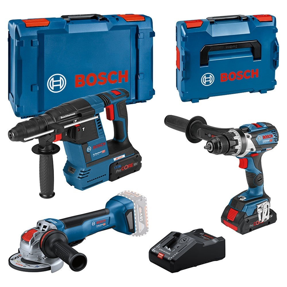 GSR 18V-110 C, GWX 18V-10 P, GBH 18V-26 F, 1x ProCORE18V 4,0Ah, 1x ProCORE18V 8,0Ah accu's en lader GAL 18V-160 inbegrepen.
