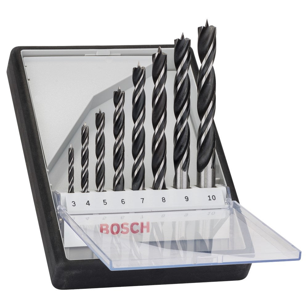 8-delige houtboor-set met diameters van 3mm tot 10mm, voorzien van centreerpunt en scherpe snijkanten voor precisieboringen in hard- en zachthout; inclusief compacte opbergkoffer.