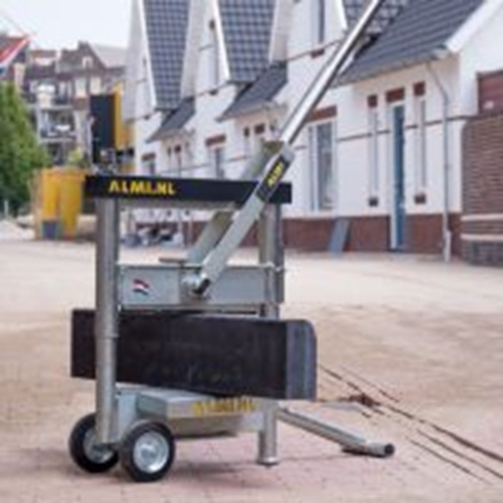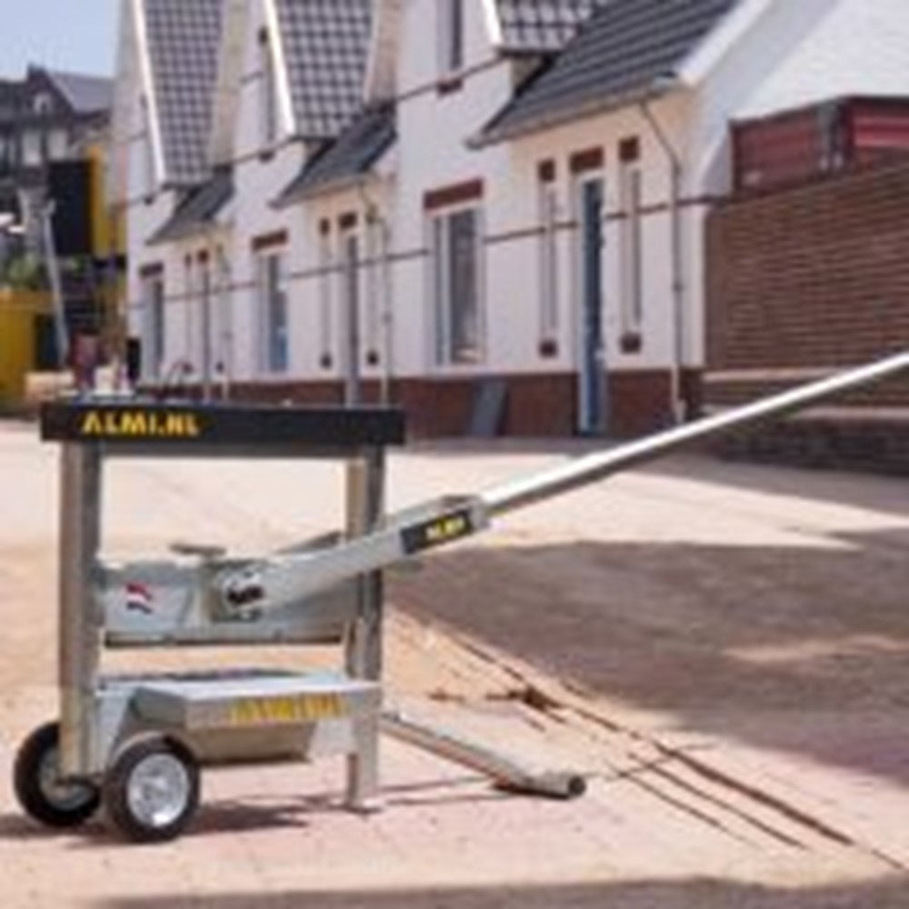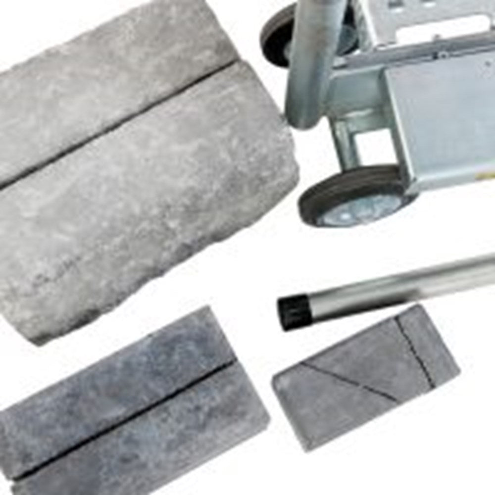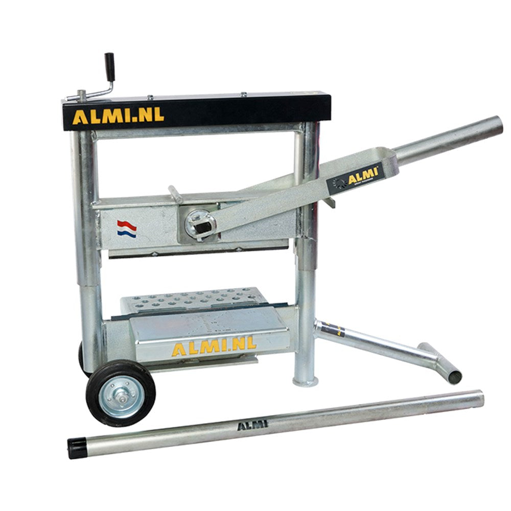 Set bevat: Almi AL43U EASY handmatige steenknipper (kniphoogte 10–300 mm, knipbreedte 430 mm), verzinkt, inclusief hefboom, vierzijdig mes en transportwielen – ideaal voor het knippen van klinkers, kalkzandsteen en trott...