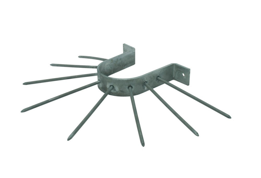 Anti klimbeugel met pennen (type vlak of versprongen) om aan de muur te bevestigen rond een regenpijp (inwendige breedte beugel 105 mm), ter voorkoming van het omhoog klimmen via de regenpijp. oppervlaktebehandeling: TV Technische specificaties verpak...