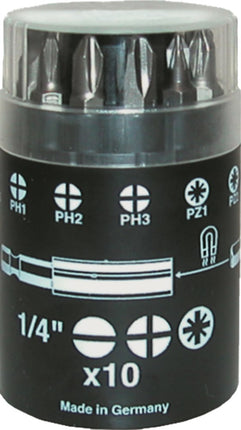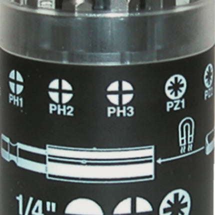 10-delige set, met 1/4" bits met lengte van 25 mm, in kunststof houder. Bestaande uit:Magnetische bithouder. 3 bits zaagsnede aandrijving: 4,5; 5,5 en 6,5 mm. 3 bits kruiskop aandrijving: PH1, PH2 en PH3. 3 bits kruiskop aandrijving: PZ1, PZ2 en PZ3. ...