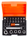 26-delige bit- en doppenset: 18 bits + 5 doppen + 1 bit ratel + 1 adapter + 1 bit houder. In een kunststof doos. Aandrijfvierkant: 1/4" DIN 3126-C 6, ISO 1173. Uitvoering: bits zinkfosfaat; doppen verchroomd en bit ratel verguld.