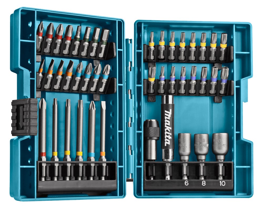Makita B-55697 43-delige bitset met kleurgecodeerde Phillips-, Pozidriv-, Torx-, inbus-, sleuf- en Torx-beveiligingsbits, inclusief magnetische bithouder en schroefgeleider, geschikt voor 12V boor-/schroefmachines. Lees meer