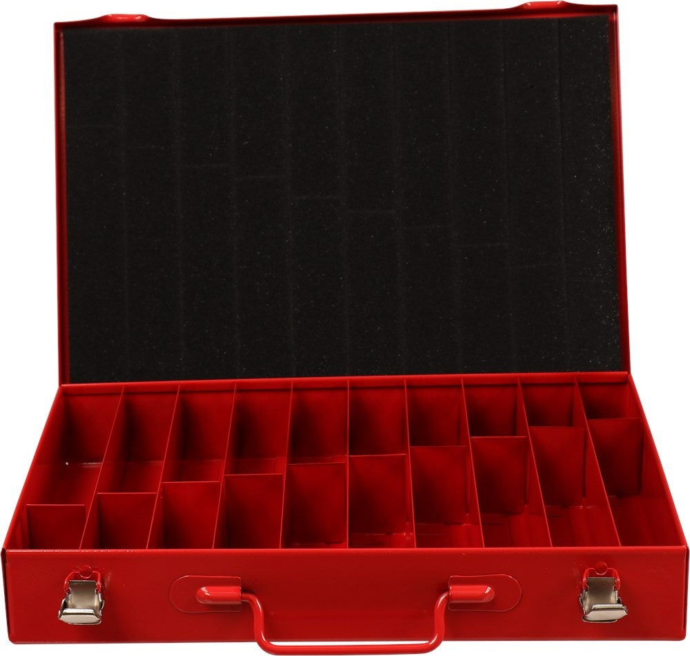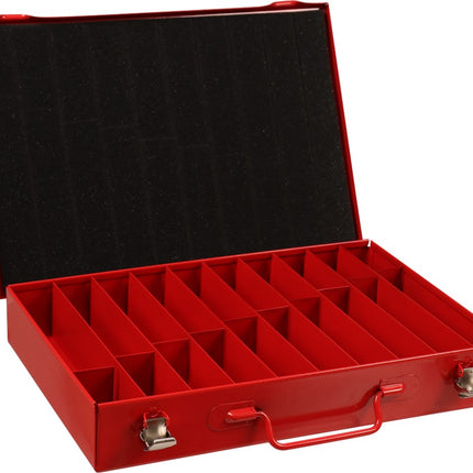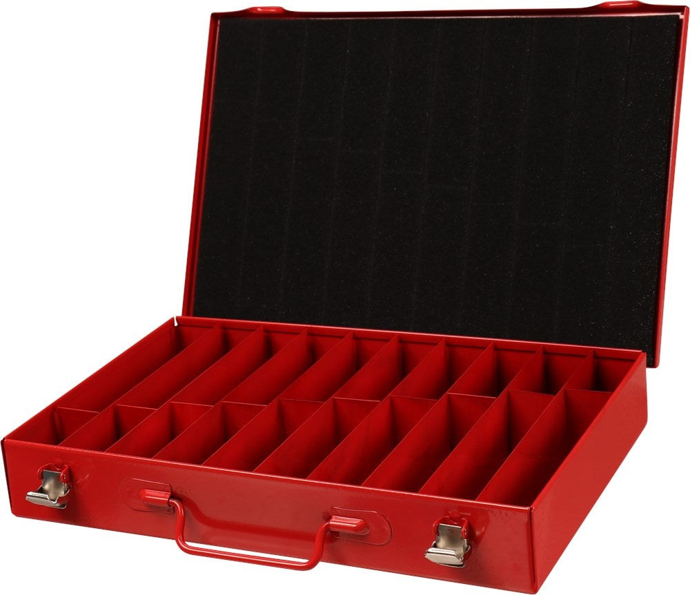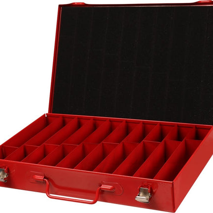 Metalen rood gelakte kist met twee sluitingen en metalen vakindeling voor 170-delige HSS metaalborenset. Afmeting 330x234x47 mm. Lees meer