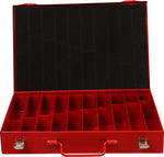 Metalen rood gelakte kist met twee sluitingen en metalen vakindeling voor 170-delige HSS metaalborenset. Afmeting 330x234x47 mm.