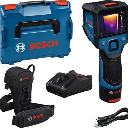 Set bevat: GTC 12V-450-13 thermodetector met 256x192 resolutie, inclusief 12V 2,0Ah accu, GAL 12V-40 lader, L-BOXX, USB-C-kabel en tas. Ideaal voor inspecties en temperatuurmetingen.