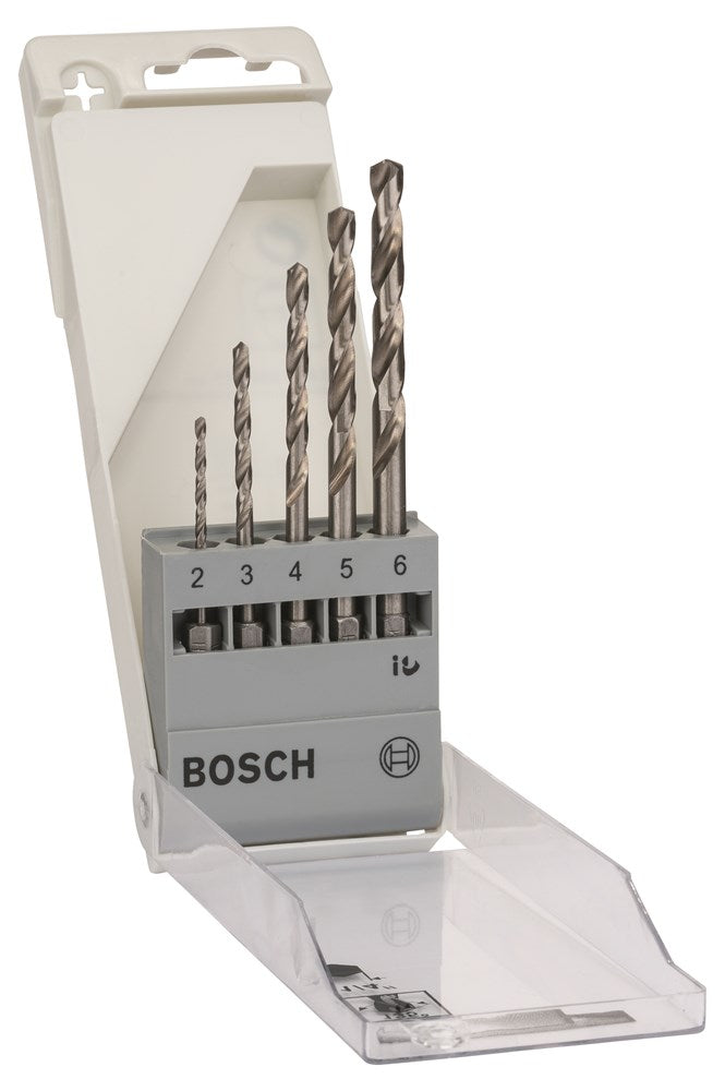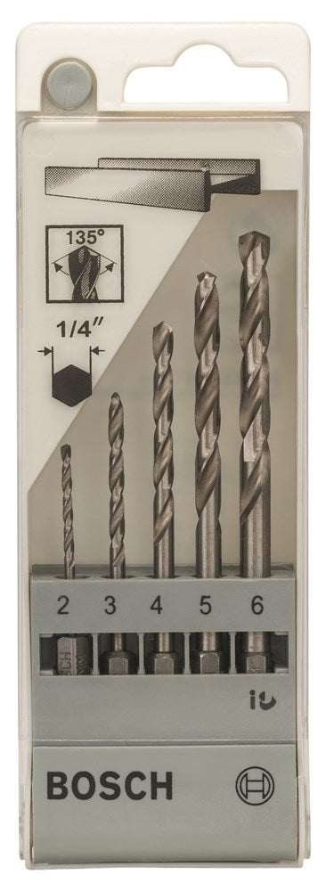 Set van 5 hoogwaardige HSS-G metaalboren met zeskantschacht, geschikt voor precisieboringen in diverse metalen en harde kunststoffen.