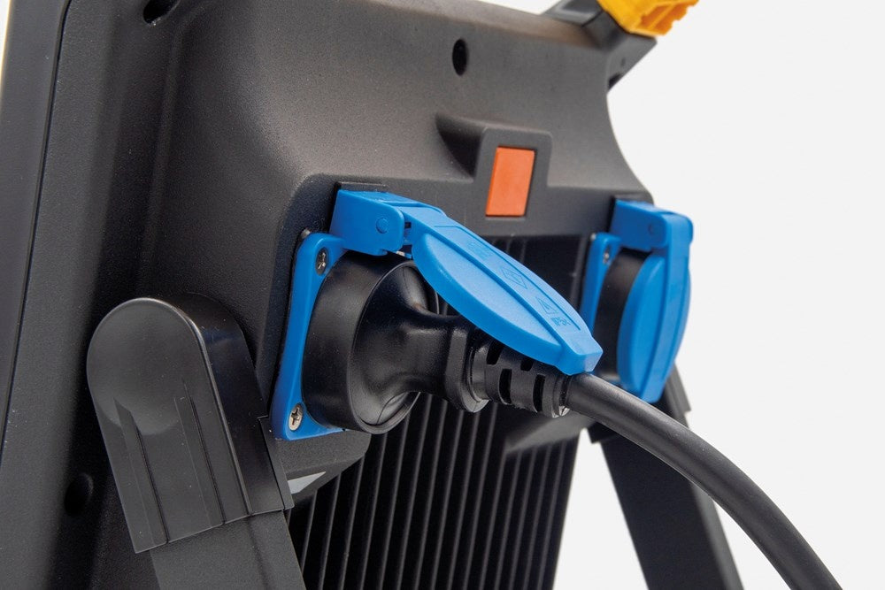 Vetec LED armatuur VLR100, met kunststof/ aluminium behuizing met slagvaste polycarbonaat antiverblindingsruit. Voorzien van geïntegreerde handgreep, 5-voudig verstelbare steunbeugel en 2 contactdozen.