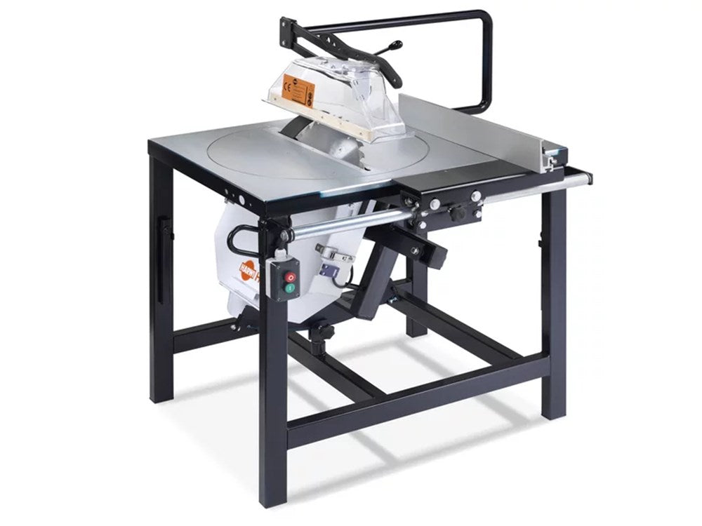 Set bevat: een stevige bouwzaag met een 3 kW/400 V motor, draaibare tafel, zaaghoogte tot 120 mm, inclusief HM‑blad en veiligheidskappen. Zonder wielenset.