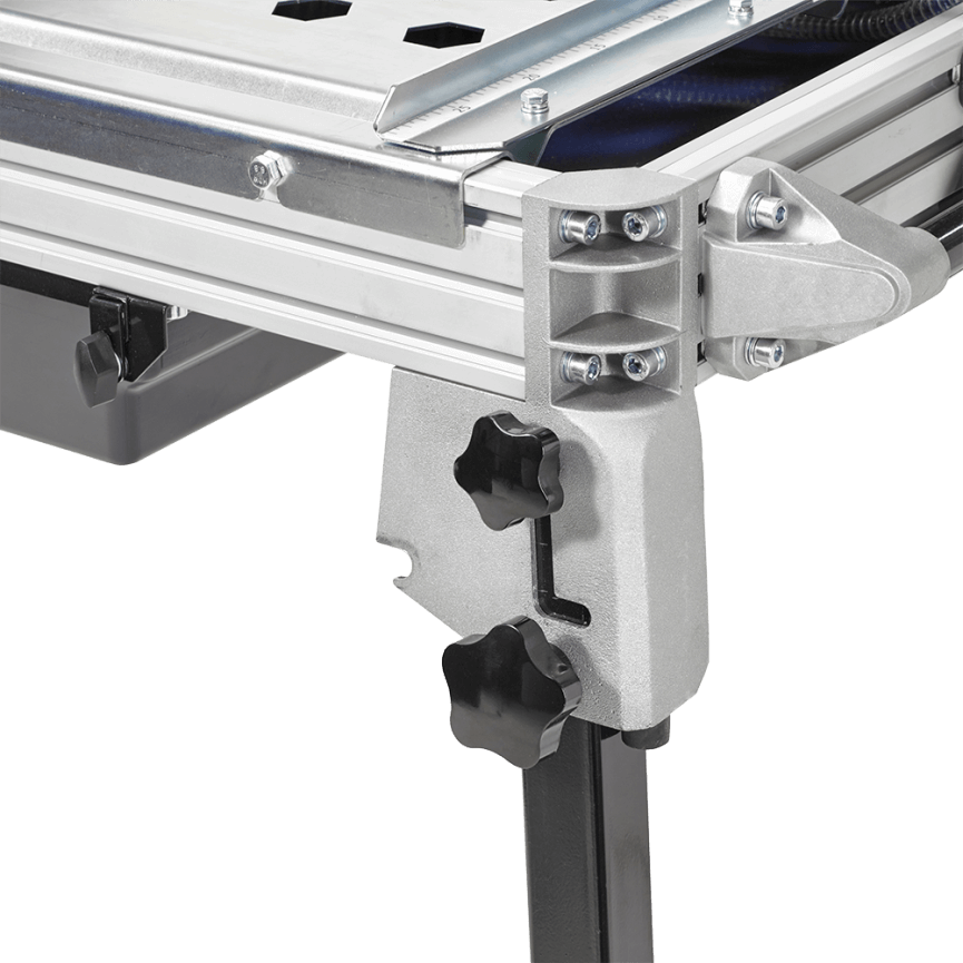 Duurzame hightech constructie in aluminium en ABS. Met zijtafel en verlengde materiaalaanslag. Tot 20% gewichtsbesparing ten opzichte van conventionele machines. Ideaal voor het zagen van natuursteen en betontegels. Geleverd zonder zaagblad.