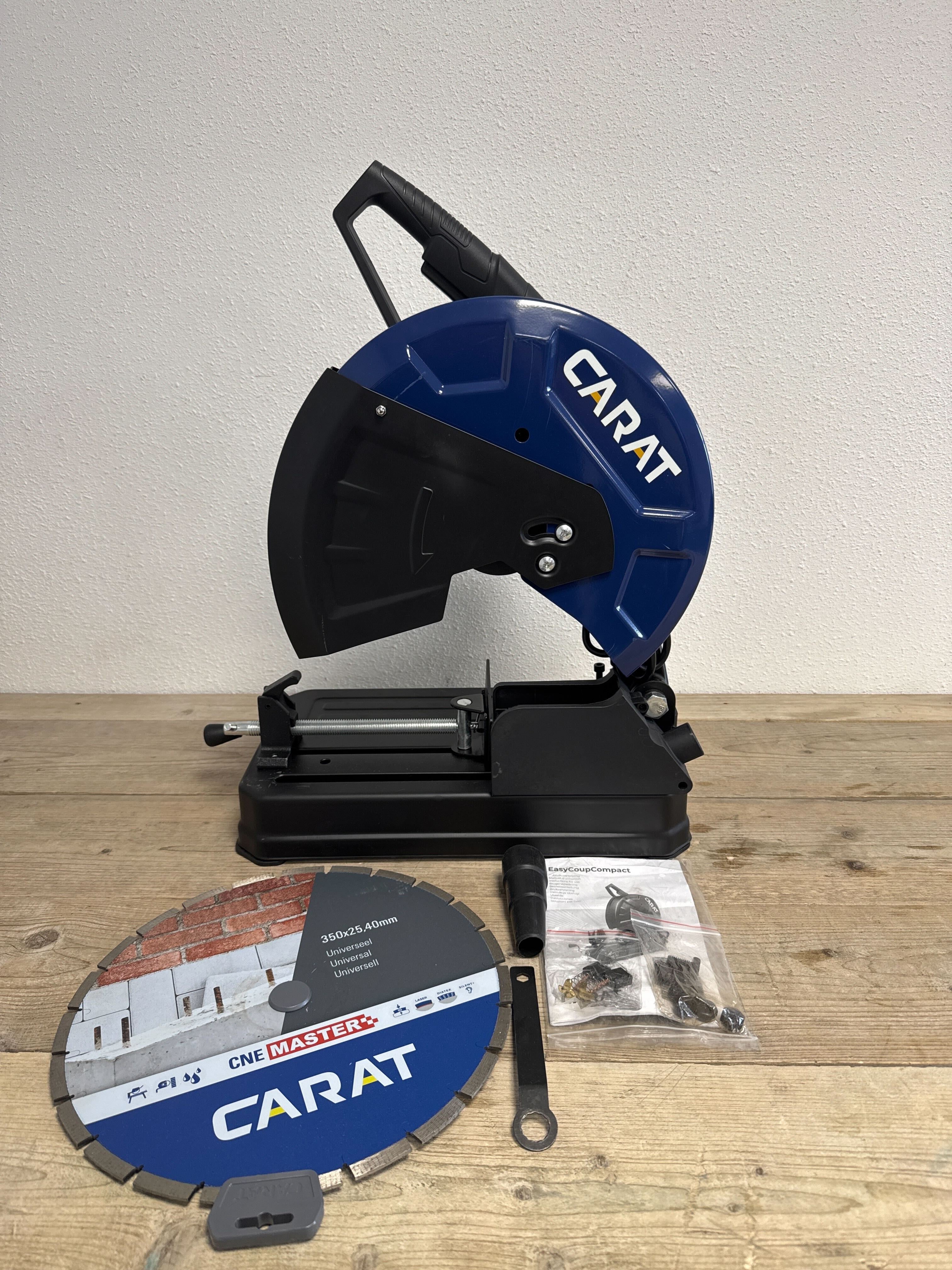 Set bevat: 1x Carat Easycoup Compact 350 Steenzaagmachine met universeel diamantzaagblad Ø350mm, geschikt voor droog zagen van baksteen, beton en natuursteen.