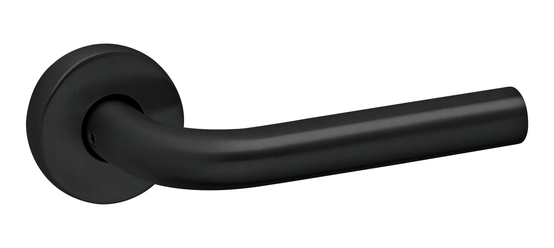Deze kwalitatieve deurkruk Gebogen is zwart RAL9005 gepoedercoat en geschikt voor intensief gebruik. De onderrozet is gemaakt van kunstof.