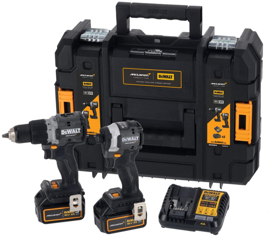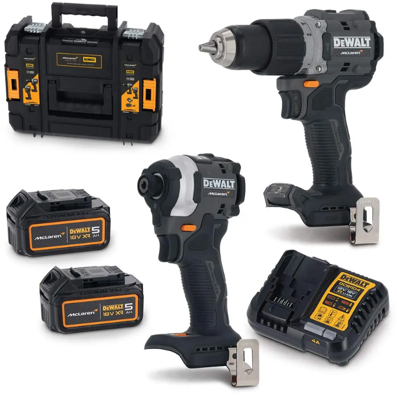 2-delige McLaren combiset met 18V XR schroef-/klopboormachine en slagschroevendraaier, geleverd met 2x 5.0Ah POWERSTACK accu’s, oplader en TSTAK-koffer.