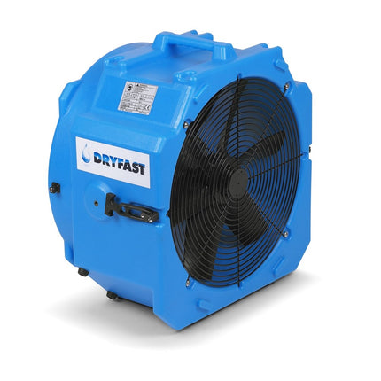 Set bevat: Axiale ventilator DAF6000, geschikt voor het versnellen van droogprocessen in grote ruimtes na waterschade, met een luchtverplaatsing van maximaal 6.000 m³/uur en een slangaansluiting van Ø500 mm.