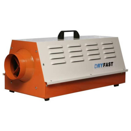 Set bevat: 1x krachtige 9 kW elektrische bouwkachel van Dryfast, met radiale ventilator en luchtslang-aansluiting, geschikt voor verwarming van middelgrote tot grote werk- of bouwruimtes.