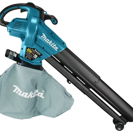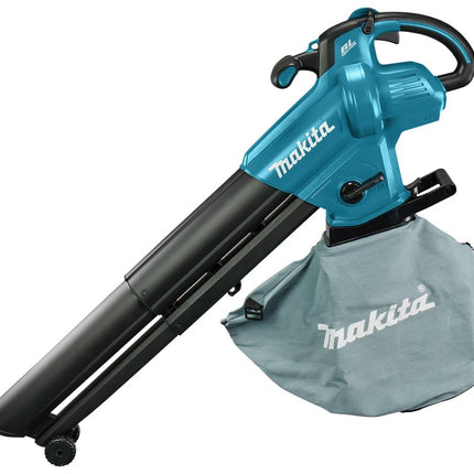 Bladblazer/-zuiger zonder accu en lader in doos. Eenvoudig schakelen tussen blazen en zuigen door grote schakelaar, ombouwen van de machine is niet nodig. Geleverd met draagharnas DUB187 en bladopvangzak assy.