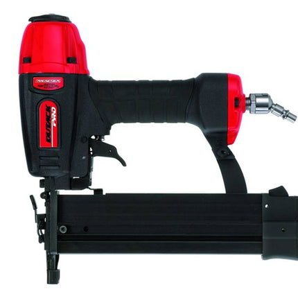 Lichtgewicht professionele pneumatische nieten- en bradtacker met magnesium body. Geschikt voor het bevestigen van plaatmateriaal en latten tot ca. 16 mm. Voorzien van diepte-instelling, voorplaat met snelsluiting + beschermvoet .