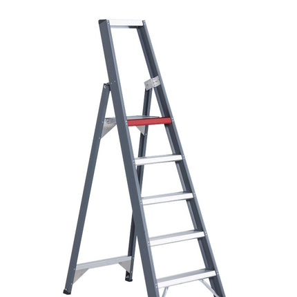 De grijze coating is niet alleen stijlvol. Het is bovendien vuilafstotend en geeft niet af aan je handen. Door de schetsschoren en grote voeten weet je zeker dat je stabiel staat. De steunbeugel is niet alleen veilig. Het bakje in de beugel geeft je ook een plek voor je gereedschap.