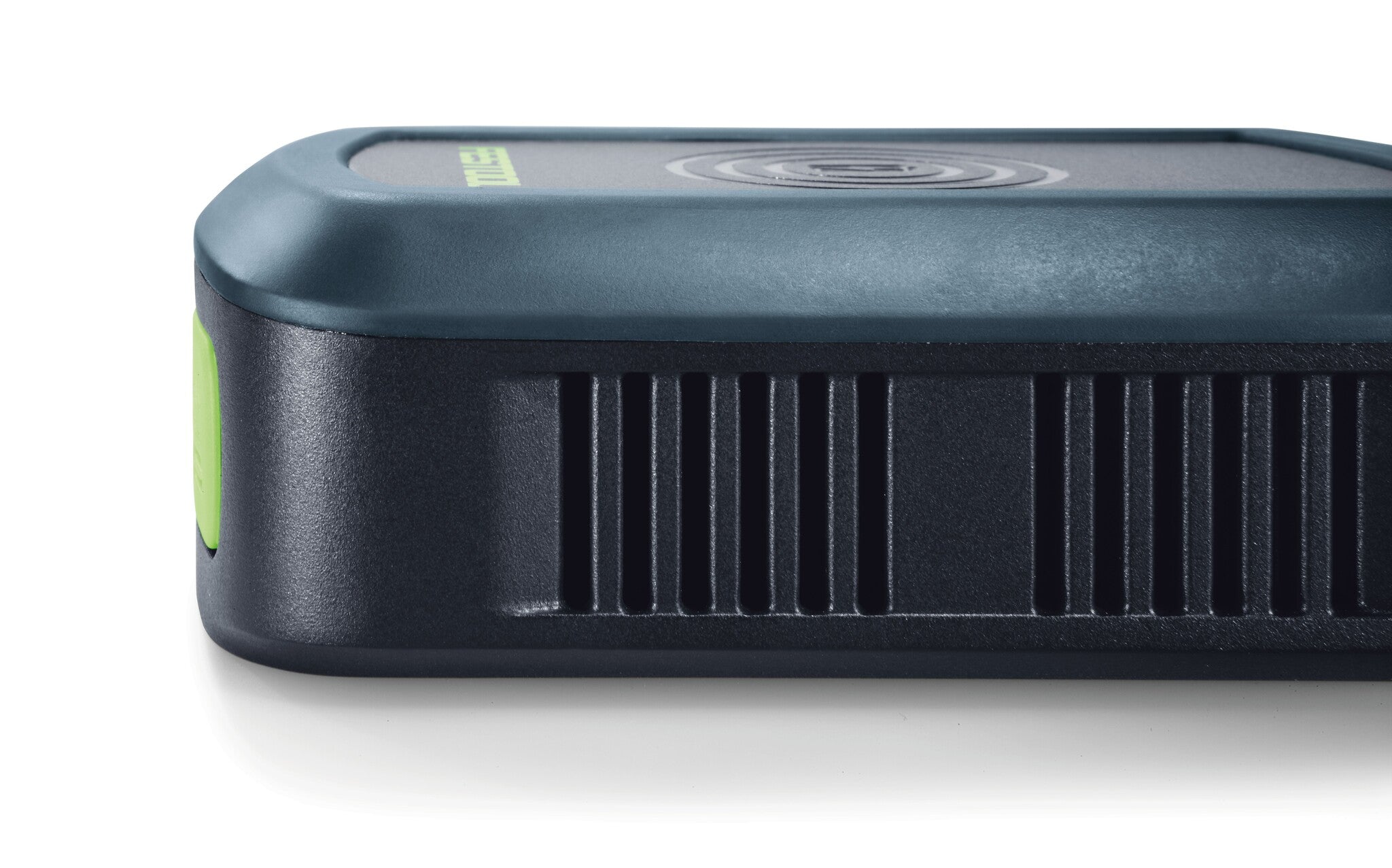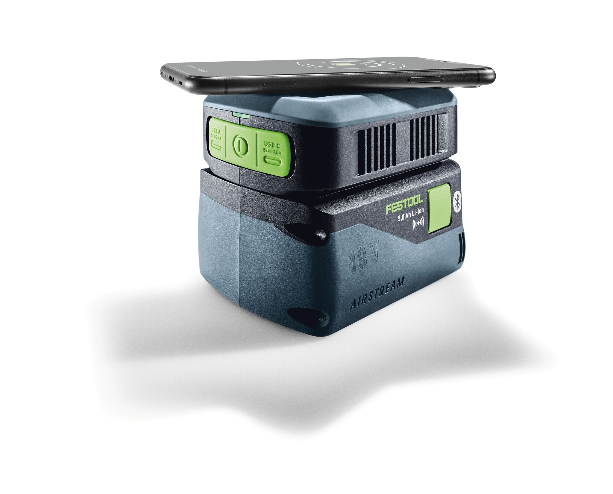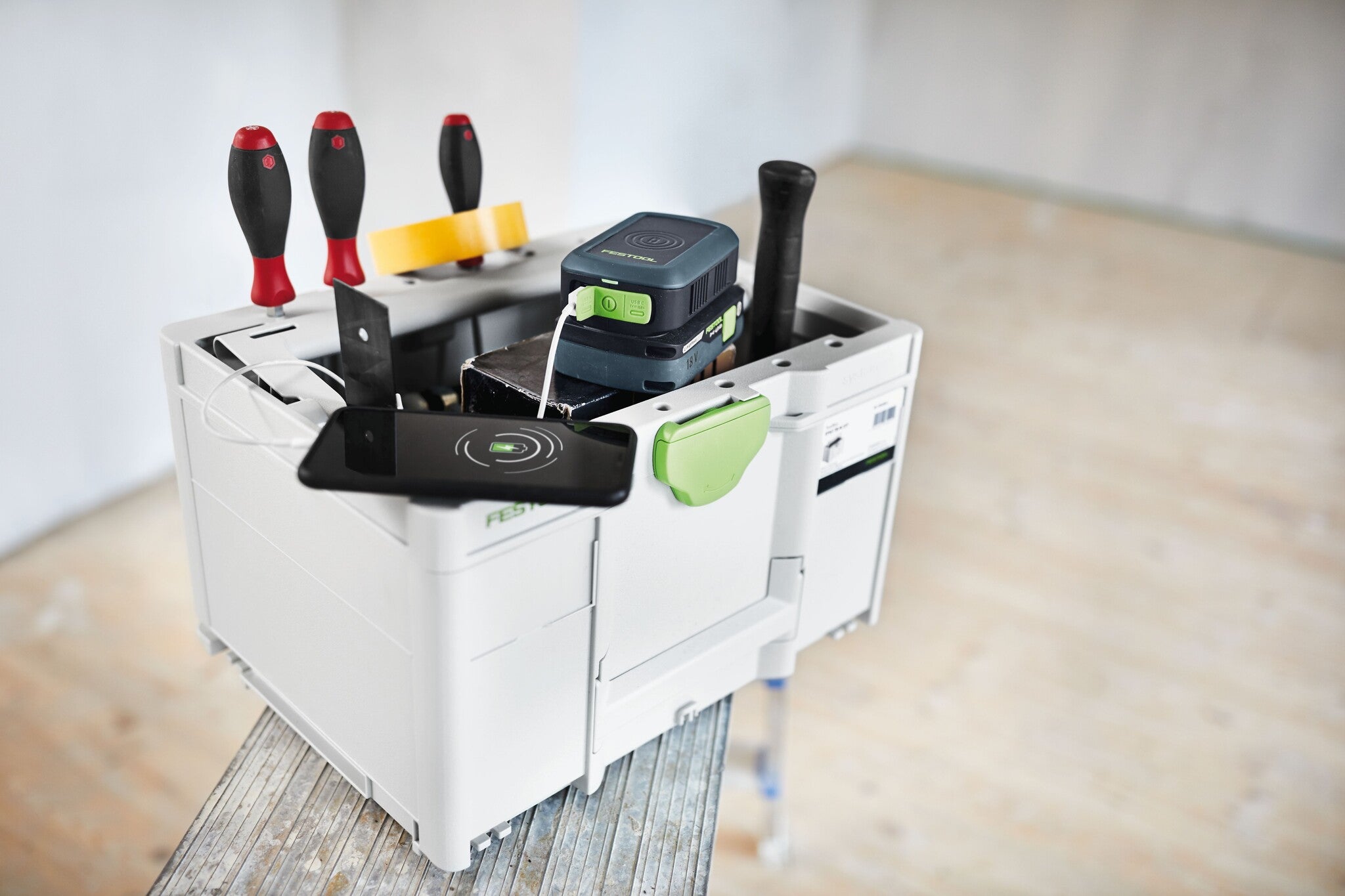 Telefoonoplader die Festool 18V accu's omzet in een powerbank, met USB-A, USB-C en inductief laadoppervlak voor het gelijktijdig opladen van maximaal drie smartphones; exclusief accu's.