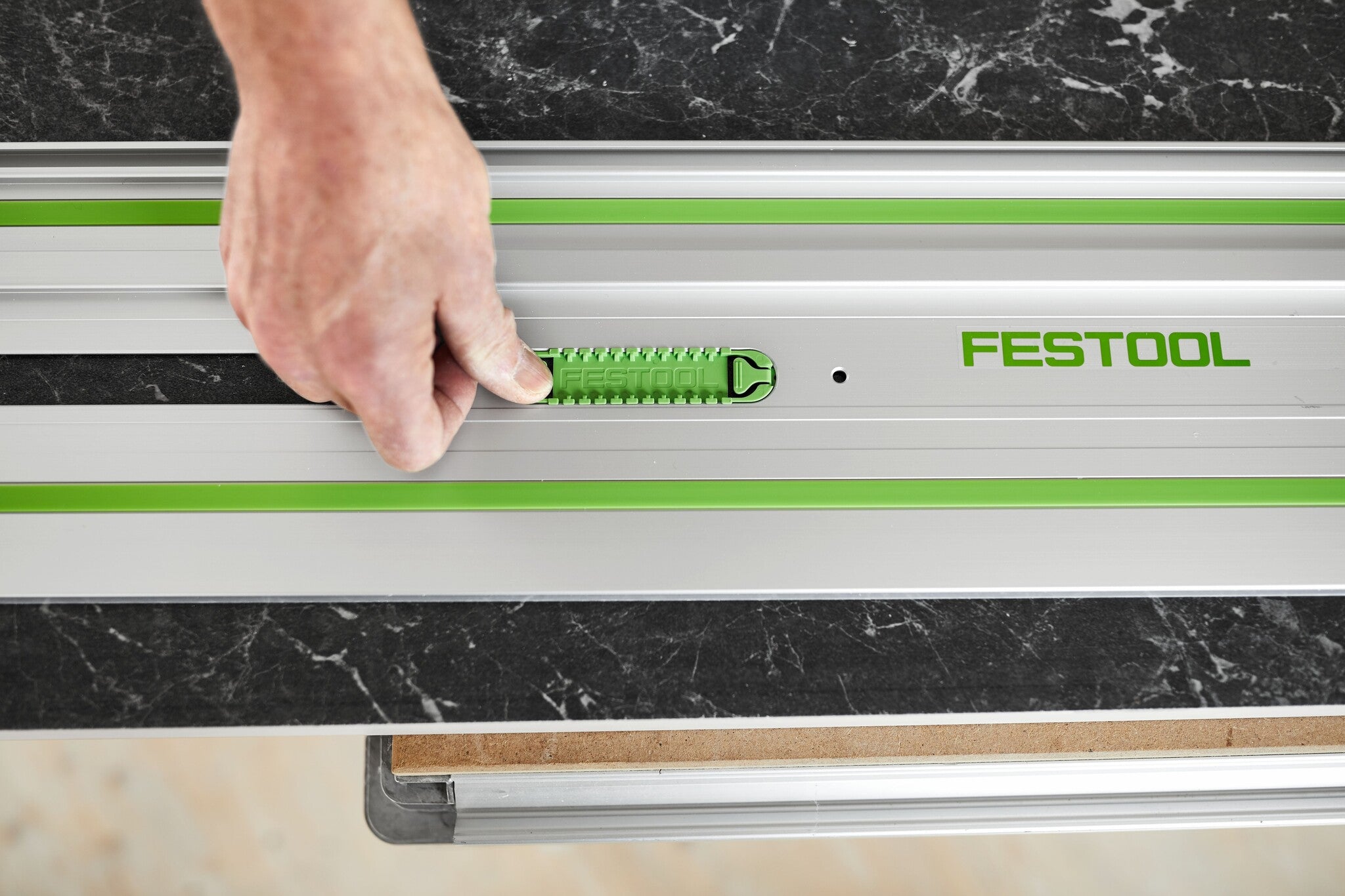 Perfect geleid in alle situaties. Goede bevestiging: de geleiderail met plakpad - precies en veilig zagen ook in moeilijke situaties