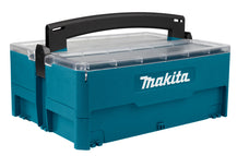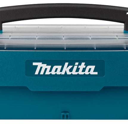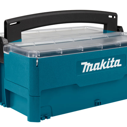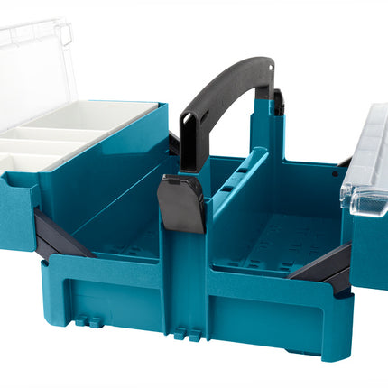 Uitklapbare gereedschapskoffer met vier compartimenten. Inclusief sorteerbakjes vullend voor één compartiment. Koppelbaar met Makita Mboxen. Technische specificaties Afm. lxbxh 395x295x235 mm