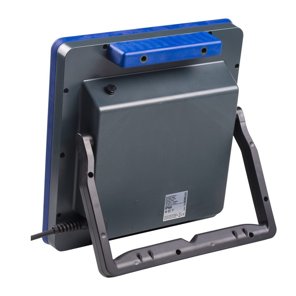 Bouwlamp met blauw/ zwarte slagvaste en waterbestendige twee-componenten kunststoffen behuizing en een transparante polycarbonaat ruit