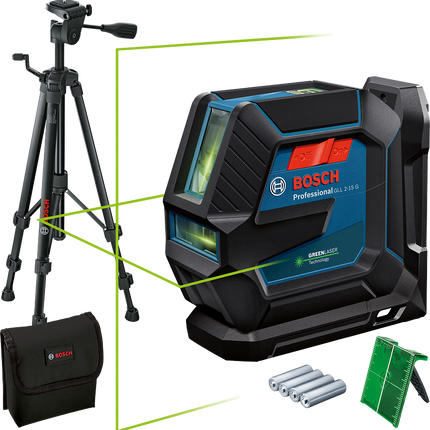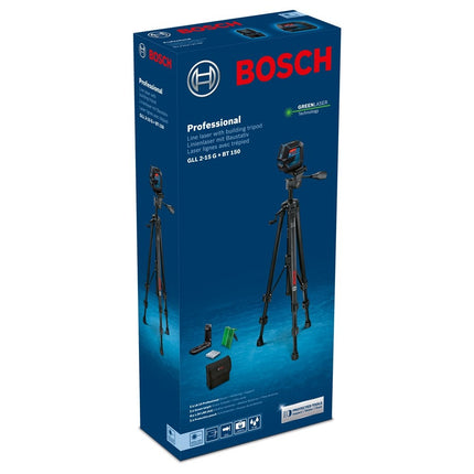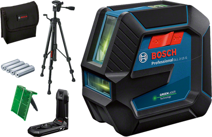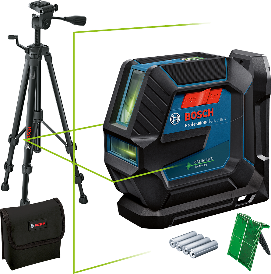 De Bosch GLL 2-15 G lijnlaser biedt groene laserlijnen voor verbeterde zichtbaarheid, een robuust ontwerp met IP64-bescherming en eenvoudige bediening, ideaal voor diverse uitlijningstaken.