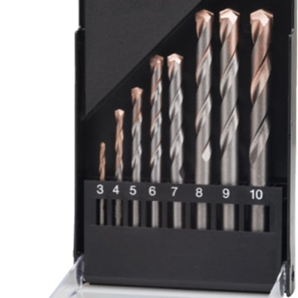 met HM-snijkant, in kunststof cassette, gevuld met boren uit artikelgroep 13.700: 3‚ 4‚ 5‚ 6‚ 7‚ 8‚ 9, 10mm