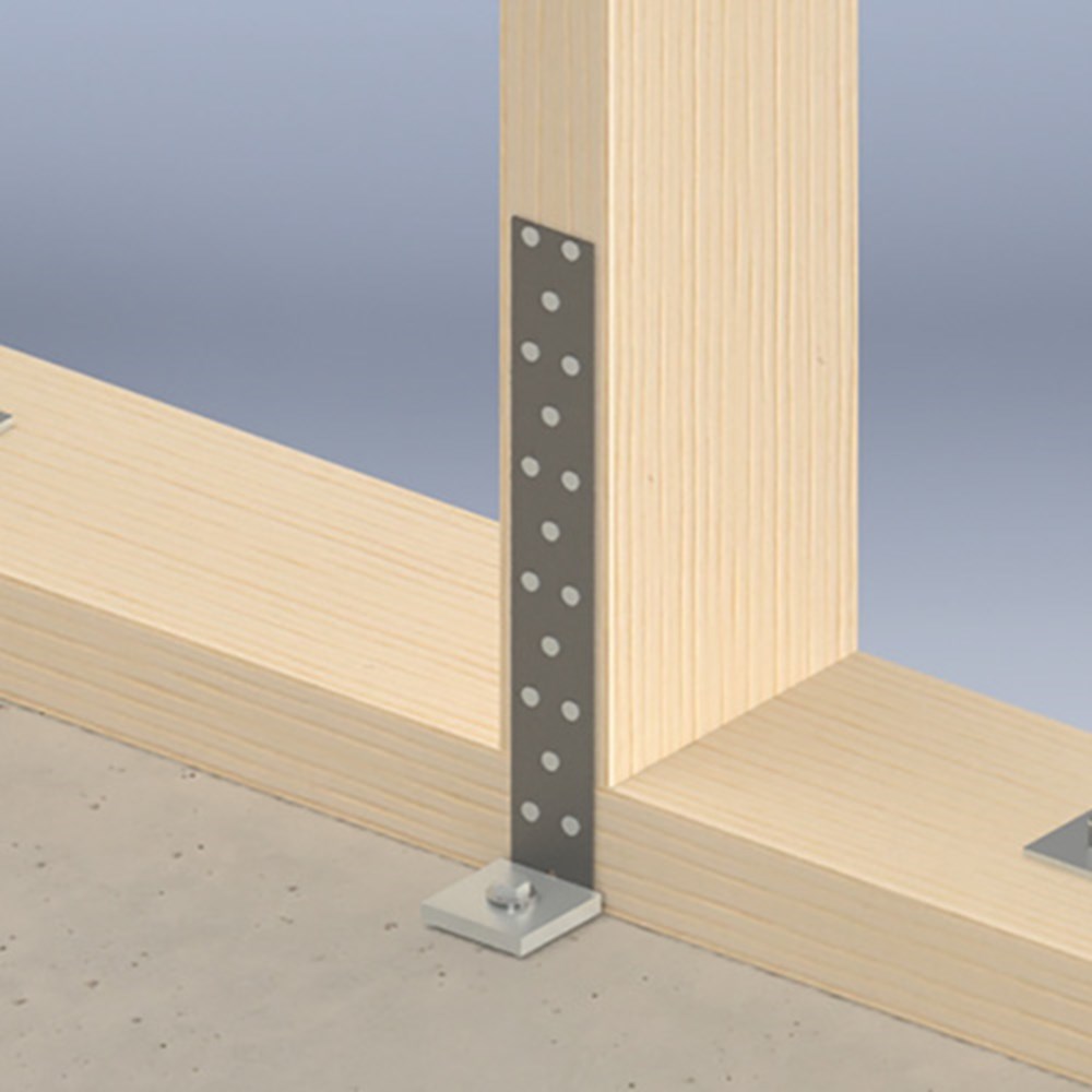 Trekanker, strip voorzien van gatenpatroon met haaks gezet gedeelte, geproduceerd uit 40x2 mm sendzimir verzinkt staal, om de trekkrachten van houtskelet bouwdelen over te brengen naar de hoofdconstructie. Aantal: 25 stuks. Lees meer