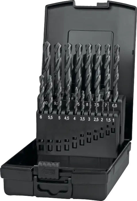 DIN 338, geslepen uitvoering, met kruisaanslijping, in kunststof cassette, gevuld met boren uit artikelgroep 11.450 (bevat diameters 1-10 x 0‚5 mm) Lees meer