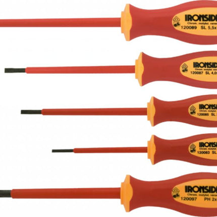 Geïsoleerde kling van chroom-molybdeen-vanadiumstaal met zwarte punt en ergonomisch gevormd, twee-componenten hecht voor optimale grip. 5-delige set. Bestaande uit: Schroevendraaiers phillips 2. Schroevendraaiers voor zaagsnede ...