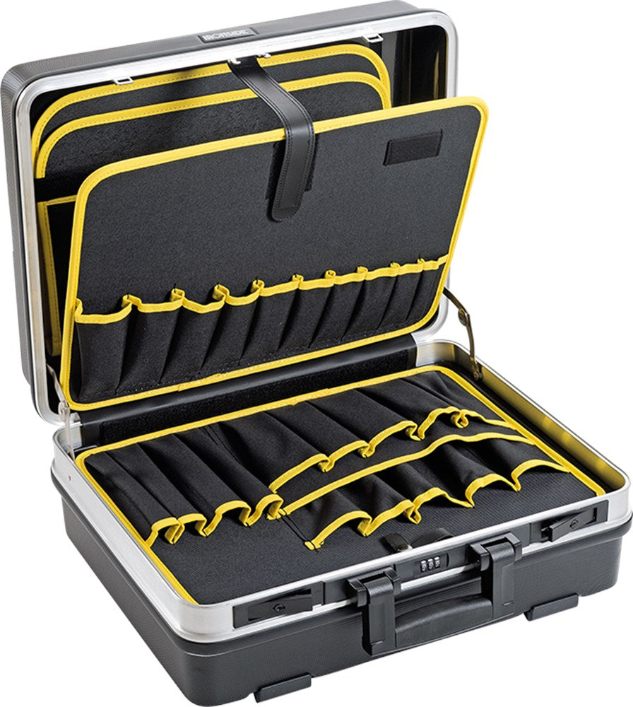 Schalen van ABS-kunststof met robuust aluminium frame. Voorzien van twee gereedschapsbladen, documentenvak en bodembak. Vrij indeelbaar met twee langschotten en drie dwarsschotten, bodemgeleiders en afdekplaat. Lees meer