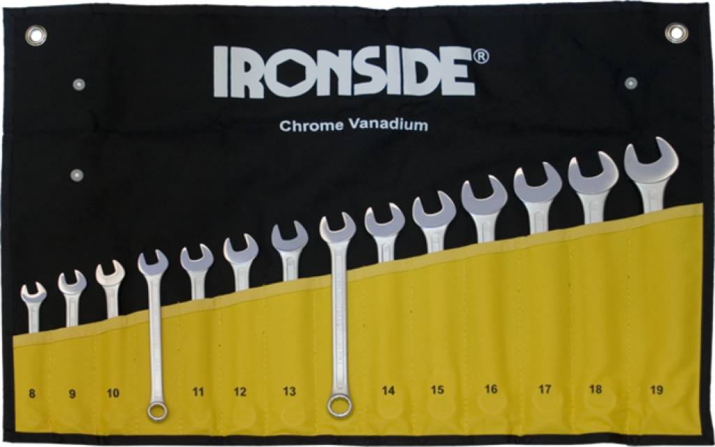 Chroom-vanadiumstaal. Ringzijde iets gebogen. 12-delig met twee extra ring-/steeksleutels 10 en 13 mm.