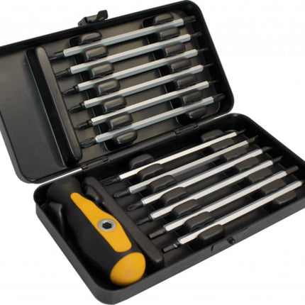 Losse chroom-molybdeen-vanadiumstalen klings met zwarte punt en een ergonomisch gevormd, twee-componenten hecht voor optimale grip. Hecht voorzien van stiftsleutelfunctie.13-delige set. Schroevendraaierklins bestaande uit: Zaagsnede 4, 5, 6 en ... Lees meer
