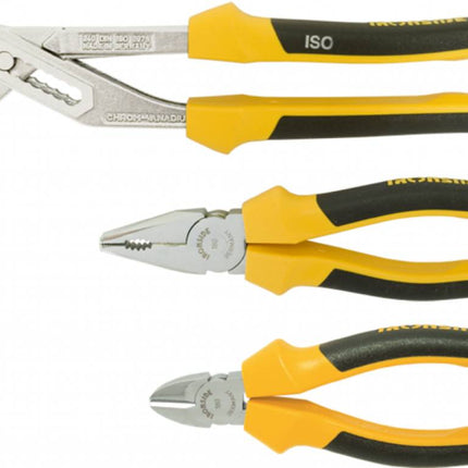 3-delig, bestaande uit: waterpomptang* 240 mm, met doorgestoken scharnier, combinatietang 180 mm en zijsnijtang 160 mm. De tangen zijn verchroomd en voorzien van zware twee-componenten handvatten.