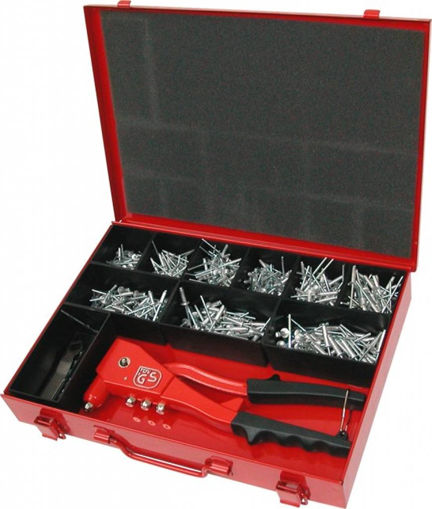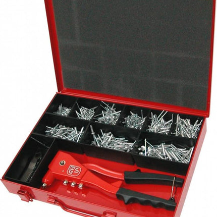 Metalen rood gelakte kist met twee sluitingen en kunststof vakindeling. Inhoud: Blindklinknagels Aluminium. afmeting mm. aantal 3,2x 850 3,2x1250 3,2x1650 4,0x1050 4,0x1450 4,0x1850 4,8x1050 4,8x1450 4,8x1850 Inclusief blin...
