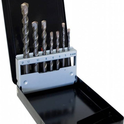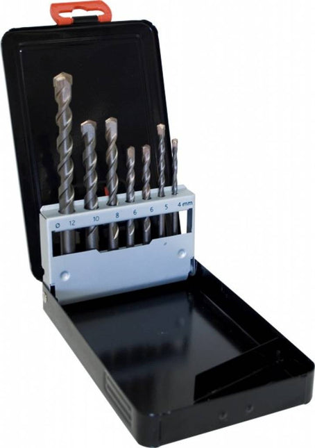 7-delige betonborenset, in metalen cassette. Inhoud: Afmeting mm. aantal 4x851 5x951 6x1002 8x1201 10x1201 12x1501