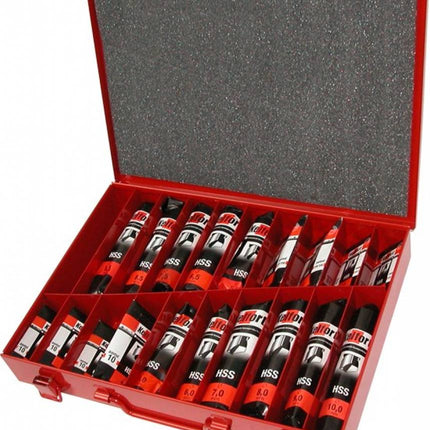 170-delige HSS metaalborenset, rolgewalst volgens DIN 338N, in metalen rood gelakte kist met twee sluitingen en metalen vakindeling. Afmeting 330x234x47 mm. Inhoud: diam. mmspiraallengte mmlengte mmaantal 1,0123410 1,5184010 2,0244910 2,530...