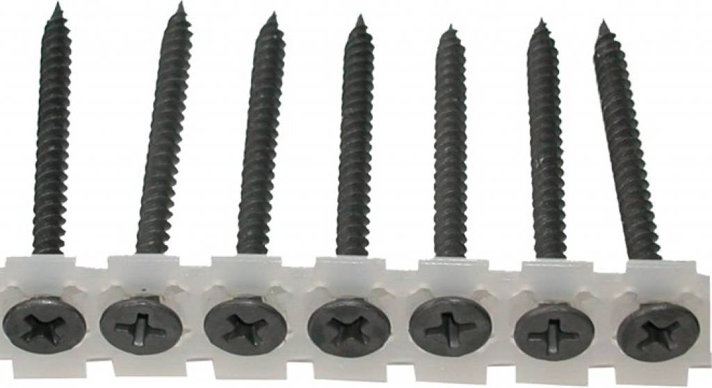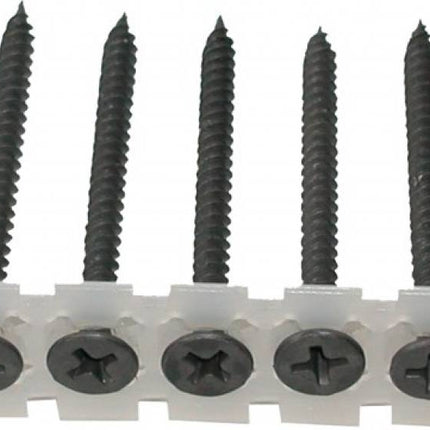 Type S. Zwart gefosfateerd, met normale draad, met scherpe punt en trompetkop met phillips kruis. 50 schroeven op band.