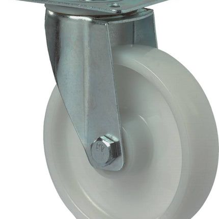 Elektrolytisch verzinkt met plaat. Wit polyamide loopvlak met rollager. In de maten 125MM, 150MM & 200MM
