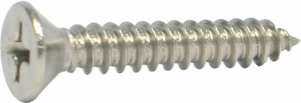 Rvs, kwaliteit AISI 304 (A2), plat verzonken kop, met phillips kruis, van gehard staal, zelftappend. Volgens DIN 7982CH. Lees meer