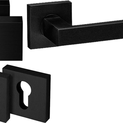 RVS AISI 304 (A2), mat zwart. Buitenrozet voorzien van RVS kerntrekbeveiliging en buitenrozet met deurduwer model Quattro. Afmeting buitenrozet 53x53x11,2 mm en afmeting binnenrozet 53x53x10,8 mm Inclusief binnenrozet profielcilinder en binnenrozet kru...