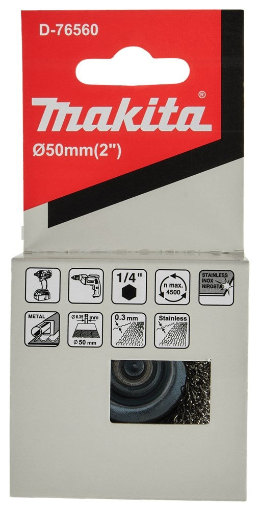 Makita komborstel 50mm met 1/4" vorm E aansluiting. Deze komborstel heeft geplooid RVS draad en is uitstekend geschikt voor het reinigen en verwijderen van verf, roest, aanslag en schilfers, of voor het ontbramen van RVS en staal. Ook geschikt voor het...