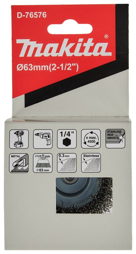 Makita komborstel 65mm met 1/4" vorm E aansluiting. Deze komborstel heeft geplooid RVS draad en is uitstekend geschikt voor het reinigen en verwijderen van verf, roest, aanslag en schilfers, of voor het ontbramen van RVS en staal. Ook geschikt voor het...