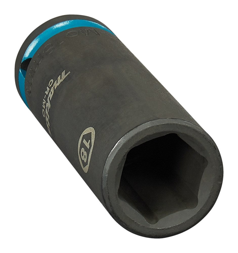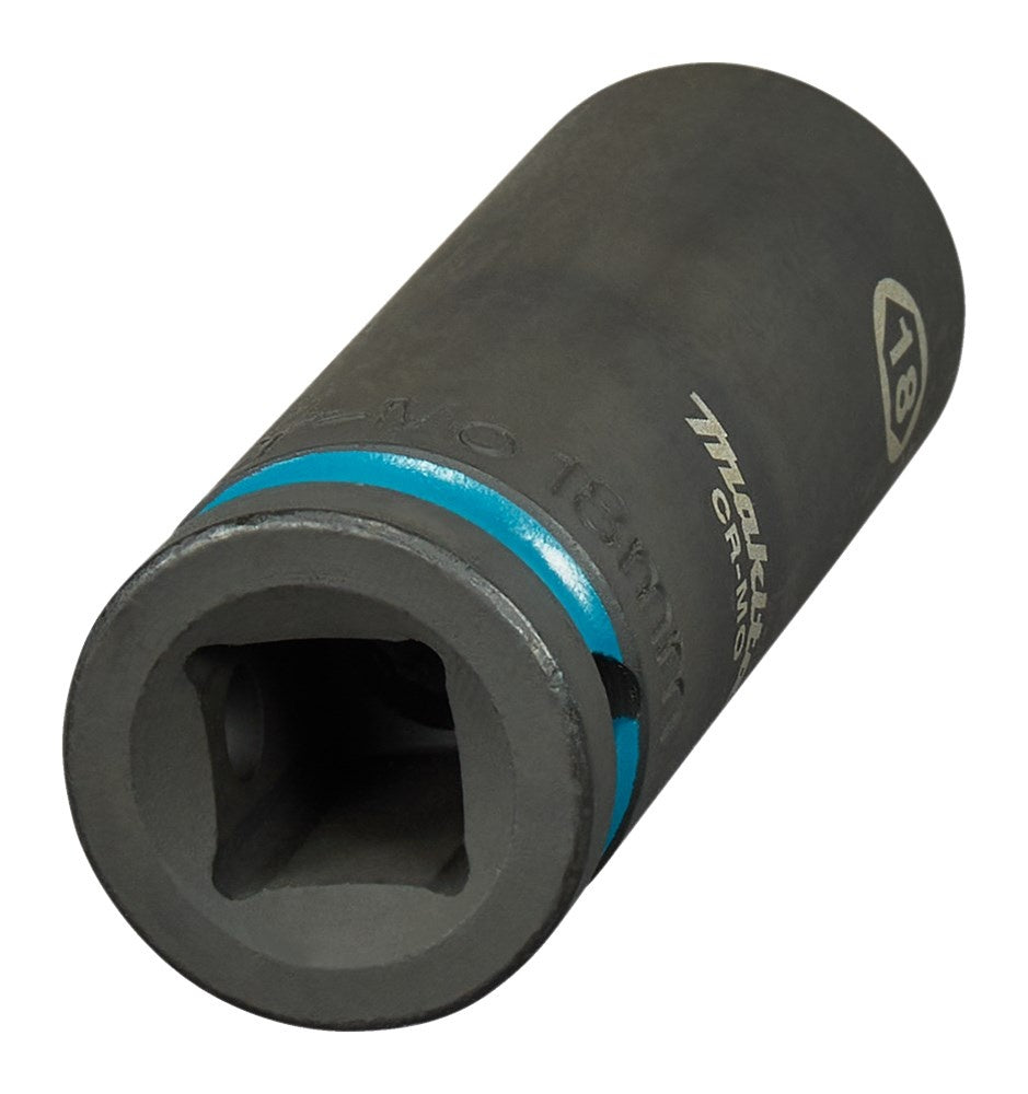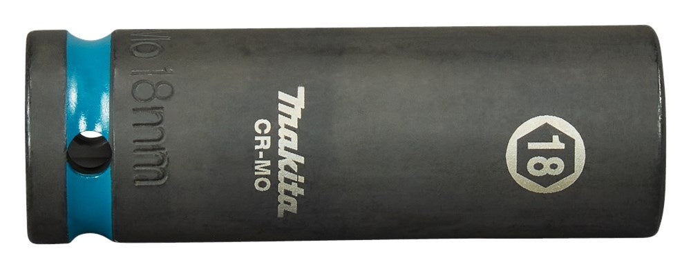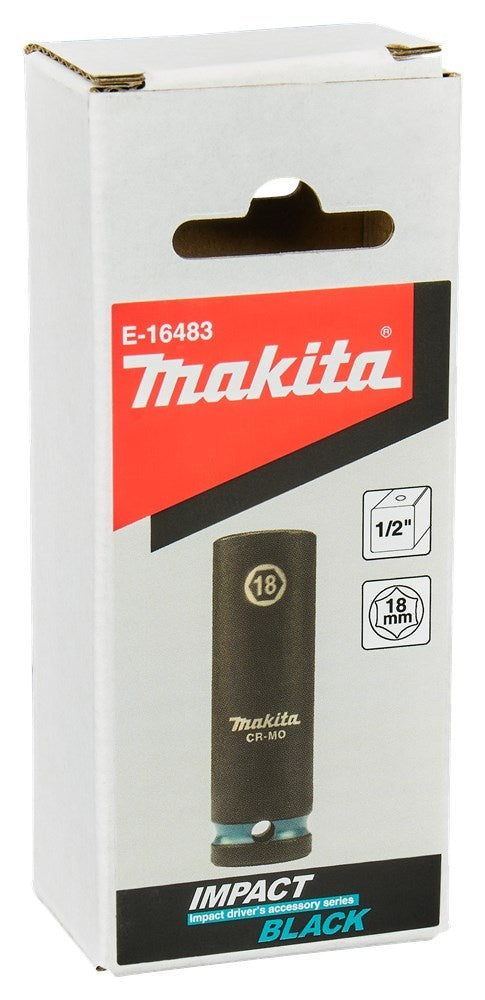 Extra lange Makita 18mm krachtdop uit de Impact Black serie, met 1/2" VK aansluiting. Deze dop wordt geleverd zonder O-ring en borgpin.