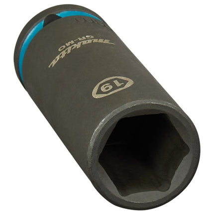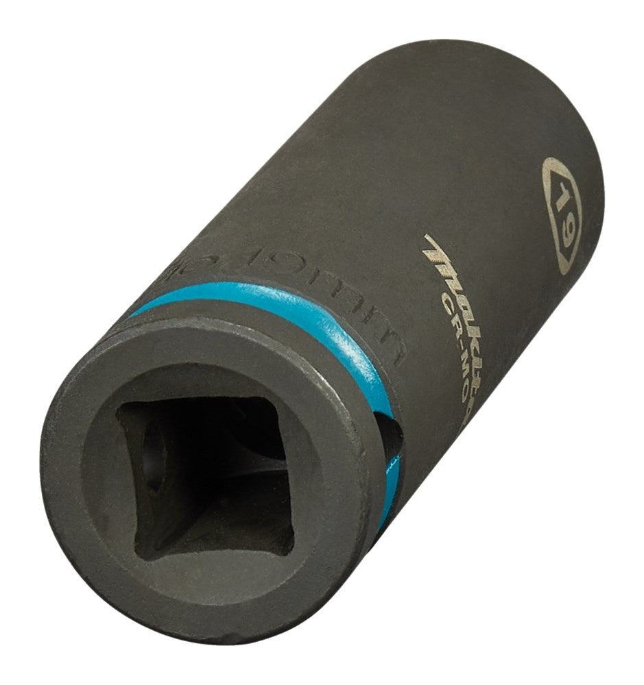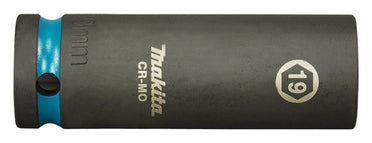 Extra lange Makita 19mm krachtdop uit de Impact Black serie, met 1/2" VK aansluiting. Deze dop wordt geleverd zonder O-ring en borgpin.