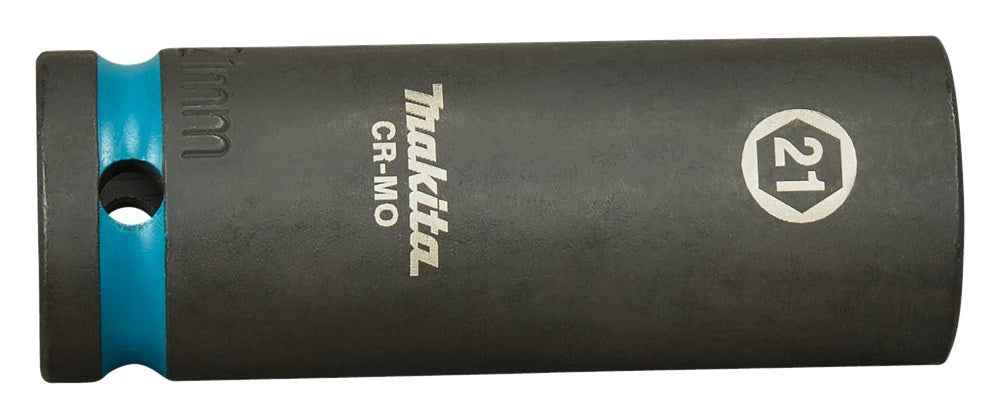 Extra lange Makita 21mm krachtdop uit de Impact Black serie, met 1/2" VK aansluiting. Deze dop wordt geleverd zonder O-ring en borgpin.