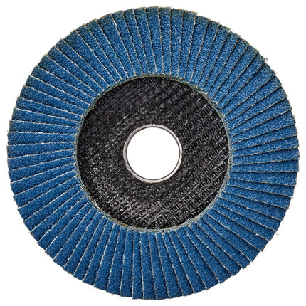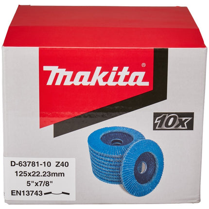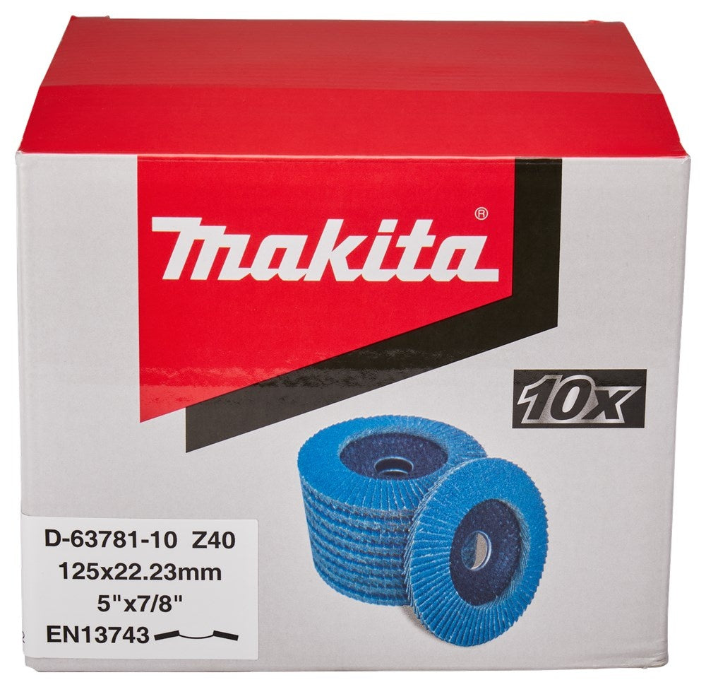 Lamellenschuurschijven zijn voorzien van lamellen bestaande uit een rug van vezelstof en korrels. Deze zijn geplaatst op een schijf met een rug van glasvezels. Doordat de schijf opgebouwd is uit lamellen is deze veerkrachtiger dan een schuurschijf en minder agressief voor het te bewerken materiaal. Bijzonder geschikt voor het schuren van lasnaden. Soorten korrel: Aluminiumoxide [A]: Zeer geschikt voor staal. Geschikt voor aluminium, non-ferro metalen en kunststoffen. Zirkoniumoxide [Z]: Zeer geschikt voor RVS. Geschikt voor staal, aluminium en non-ferro metalen. Keramisch aluminiumoxide [Ce]: Zeer geschikt voor RVS. Geschikt voor staal, aluminium en non-ferro metalen. Siliciumcarbide [S]: Zeer geschikt voor mortel en steen. Vom van de schijf: Vlakke schijven gebruik je voor het vlakschuren van oppervlakken. Plaatst deze onder een hoek van 0-15° op het materiaal voor een optimaal gebruik. Schuine schijven gebruik je voor het schuren van lasnaden, slijpen van vellingkanten en ontbramen. Plaats deze onder een hoek van 10-25° op het materiaal voor een optimaal gebruik. Korrels: 36/40: Lasnaadbewerking en vellingkanten. 60: Lasnaadbewerking, vellingkanten, ontbramen en vlakschuren. 80: Ontbramen en vlakschuren. 120: Vlakschuren. Voordelige Makita zirkonium-aluminiumoxide lamellenschuurschijf schuin met glasvezel versterkte rug. Diameter 125mm met korrel 40. Zeer geschikt voor: metaal. Geschikt voor: RVS en non-ferro metalen. Verpakkingseenheid: 10 stuks. Tevens per stuk verkrijgbaar D-63781.