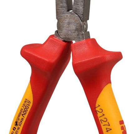 VDE-ge´soleerd 1.000 V. Met korte, platte en getande bekken. Verchroomd met zware twee-componenten handvatten. Technische specificaties product code 121274, gewicht 143 g, lengte (tang) 160 mm, verpakt per 1 st, materiaal staal (chroom-vanadium)